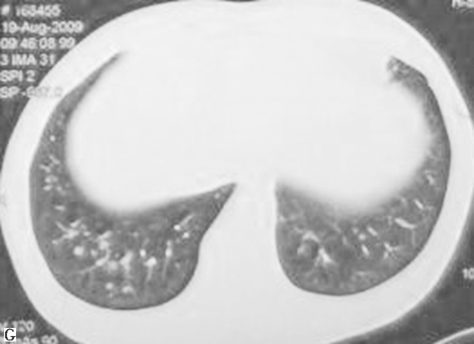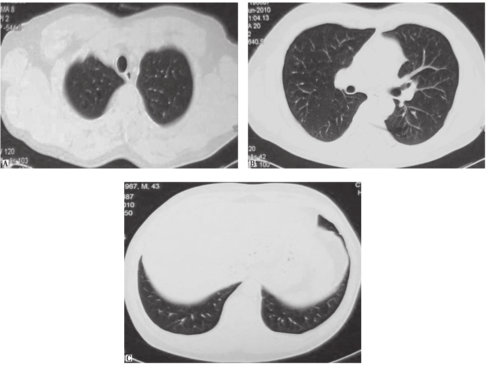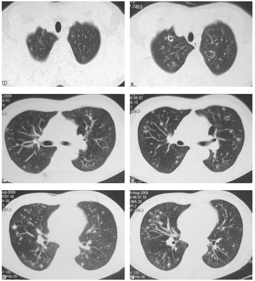 男性患者,43岁,因咳嗽6个月入院治疗。患者于2009年3月无明显诱因出现咳嗽,间断有少量白痰,无咯血、胸痛,无发热、呼吸困难,自服抗生素、止咳化痰药物后无效,在当地省级医院就诊并住院治疗。期间查血常规、尿常规、肝肾功能,未见异常;肺功能提示为孤立性弥散功能下降;胸部CT可见双肺弥漫性结节影伴空洞样改变,不排除转移瘤诊断。患者来我院进一步诊疗。发病以来,患者食欲、睡眠尚可,二便正常,体重无明显变化。