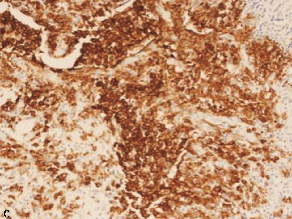 活检肺组织中,小气道周边见一实变结节(A.HE染色,100×);朗格汉斯细胞及散在嗜酸细胞,前者细胞核不规则,扭曲,可见核沟(B.HE染色,400×);免疫组化CD1a阳性(C.CD1a染色,400×)