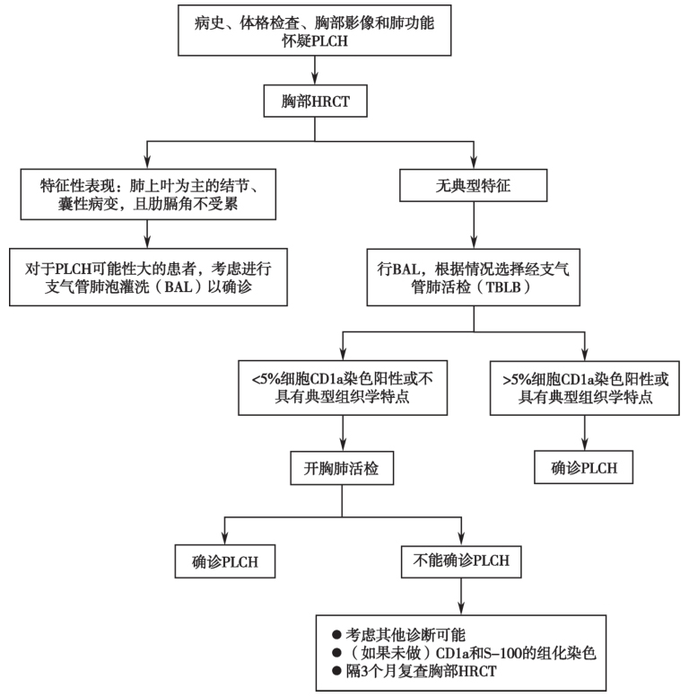 BALF细胞分类中CD1a阳性细胞比例>5%提示为PLCH。TBLB诊断阳性率在10%~40%,但发生气胸风险大,因此对于CT表现为弥漫分布的囊泡影或有多发胸膜下肺大疱患者不推荐行TBLB。外科手术肺活检能明确诊断,镜下表现为以细支气管为中心的星状间质性结节,病变时相不均一,结节、囊泡和纤维瘢痕可同时存在。免疫组化可见CD1a、S-100阳性朗格汉斯细胞。