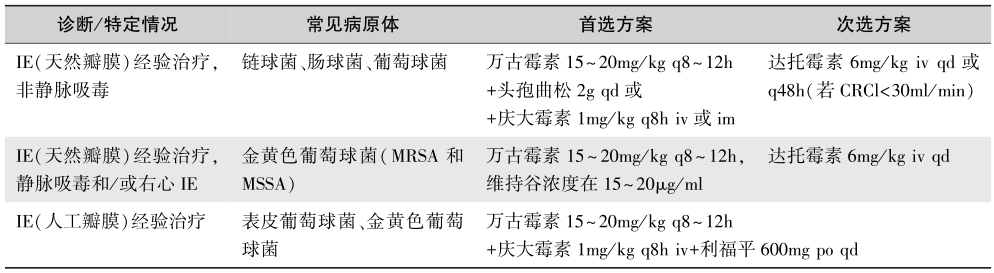 在获得微生物培养结果之前,应该给予经验性治疗。因大多数IE是由于革兰氏阳性菌感染所致,故可首选万古霉素,需要维持目标谷浓度为15~20μg/ml。其他抗菌药物的选择要依据局部微生物感染的途径来选择,详见表1和表2。