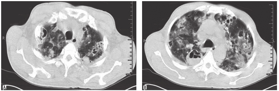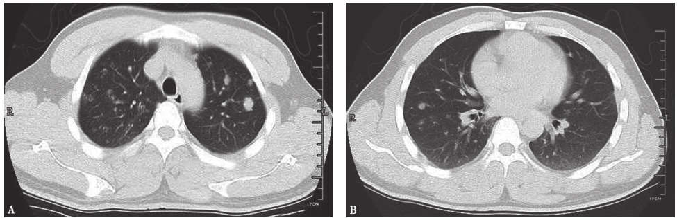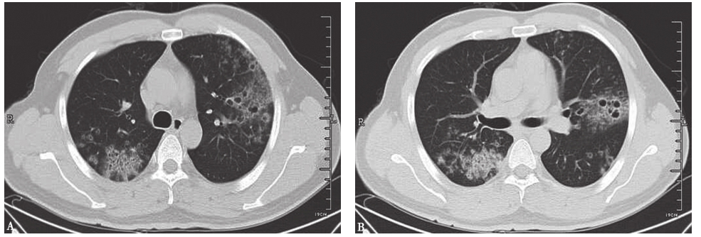胸部CT:两肺野内可见多发结节状、斑片状密度增高影,以两上肺为主,病灶形态欠规整,其内密度不均,部分内见空洞(图1)。