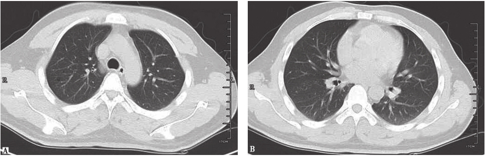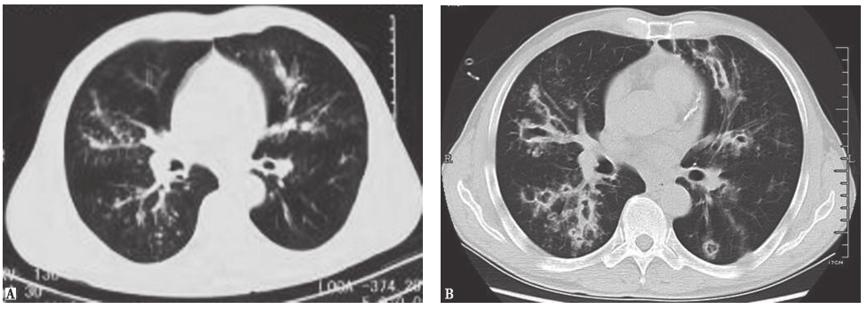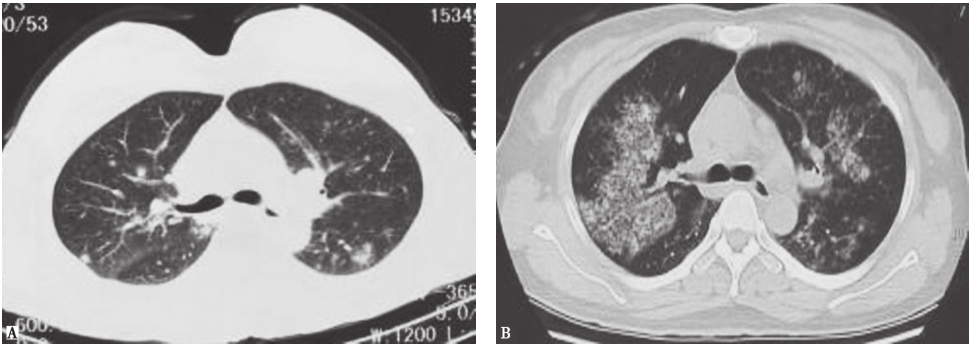 男患者性,53岁,发热、咯血1周,伴呼吸困难,诊断为侵袭性肺曲霉菌病。胸部CT初期表现为沿支气管分布的粟粒样结节(A);1周后表现为多发沿支气管分布的空洞,有中心性支气管扩张(B)