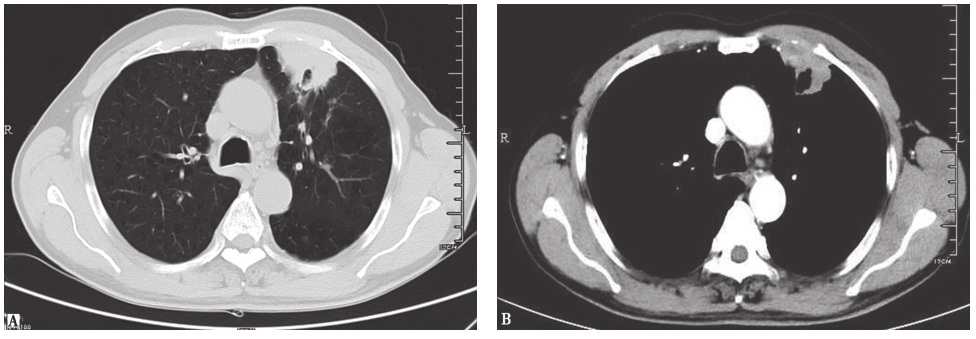 男性患者,63岁,痰中带血1个月。胸部CT发现左上肺空洞性病变,病理诊断为肺鳞癌