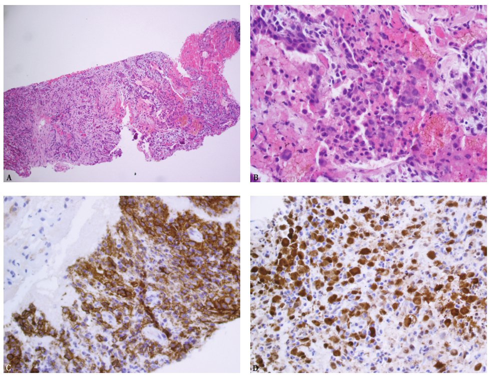 对患者左肺病灶行经皮肺穿刺活检,病理见穿刺组织内较多急慢性炎症细胞浸润,以嗜酸细胞为多(图8A、B),免疫组化见多量CD1a(图8C)、S100阳性细胞(图8D),肺穿刺液细菌、真菌培养阴性,抗酸涂片阴性。