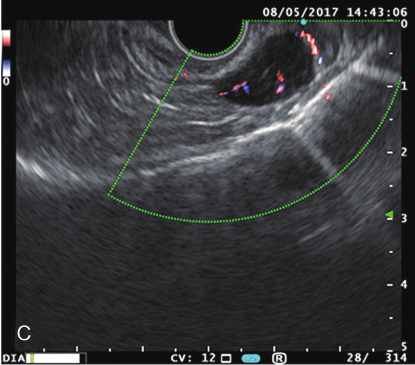 A.肿物胃镜下表现;B、C.肿物超声胃镜下表现