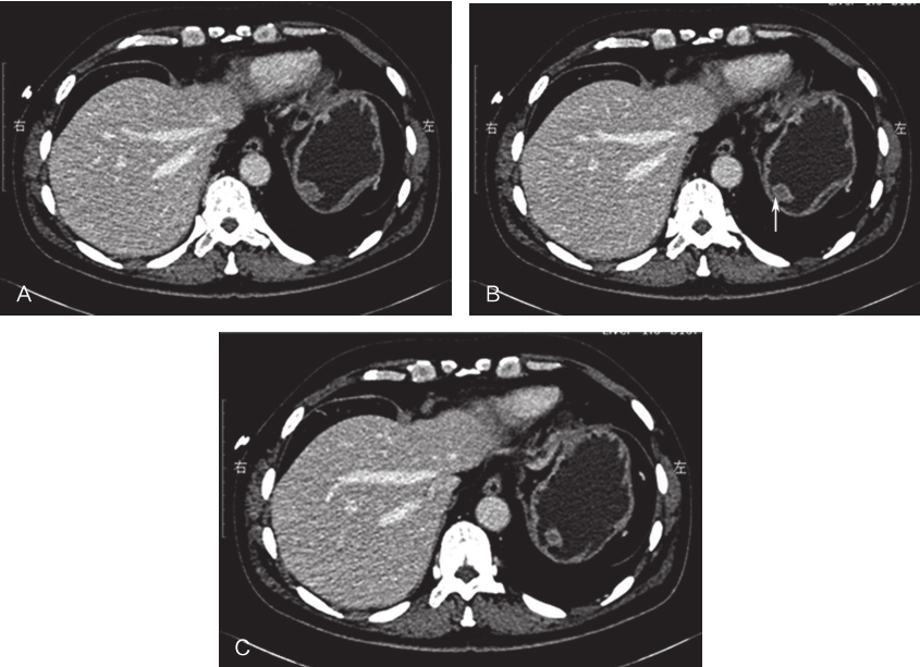 全腹增强CT:胃底软组织结节,考虑胃间质瘤可能,建议结合胃镜检查;肝顶多发小囊肿(图2)。