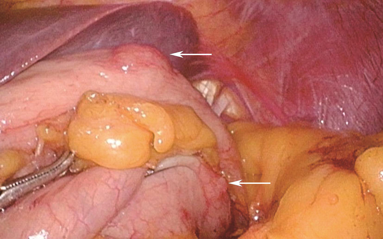 于2017年5月19日行“3D腹腔镜下胃底肿物及部分胃壁楔形切除术”,术中所见:探查腹盆腔未见明显转移结节,肿物位于胃底前壁大弯侧,大小约1.5cm×1cm,游离胃底,于胃底后壁大弯侧见另一肿物,大小约0.5cm(图3),腹腔镜下充分探查其他部位胃壁,未见其他肿物,分别以切割吻合器完整切除两个肿物(图4),术中胃镜下仔细探查胃腔,未见肿物。