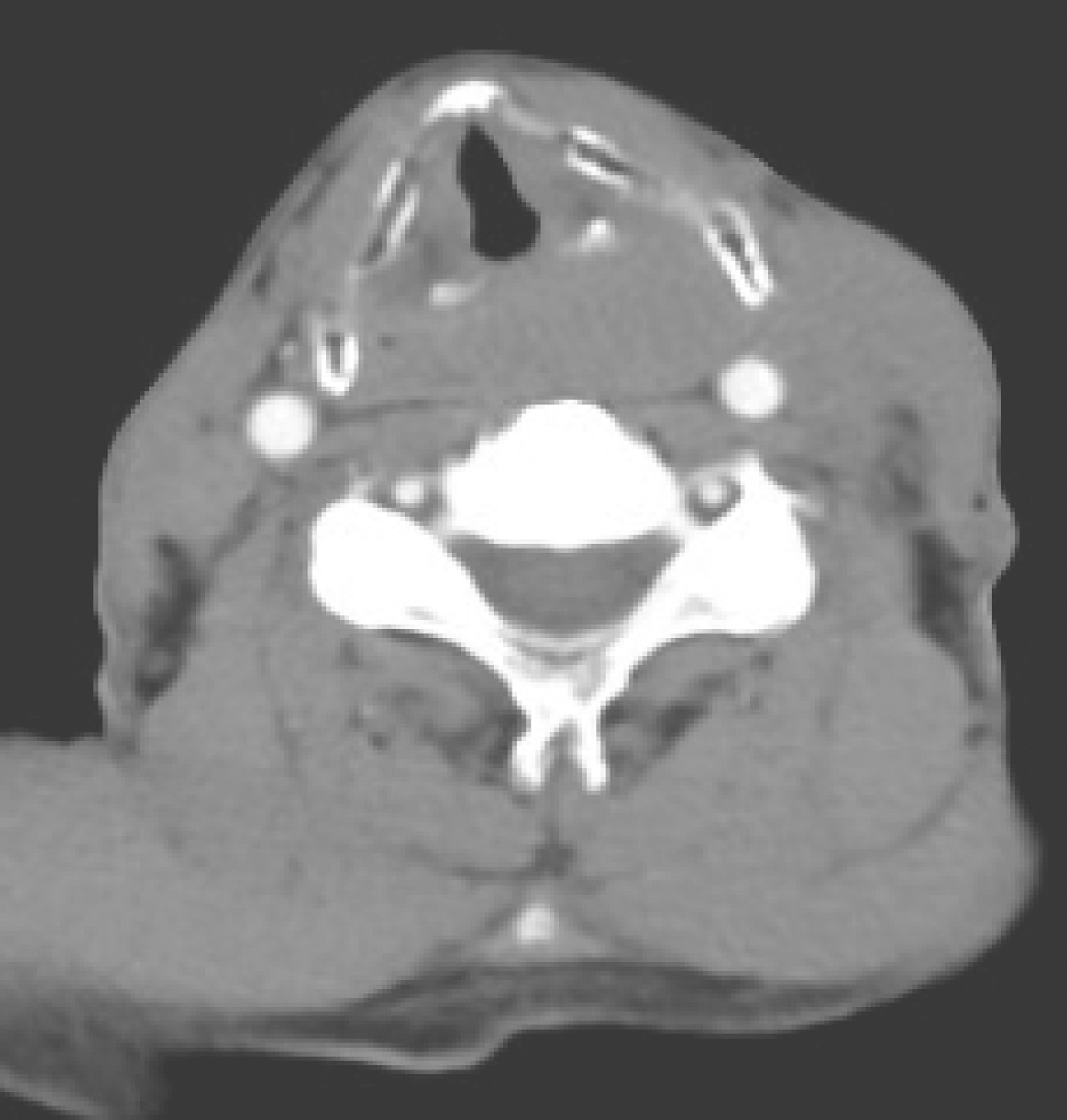 双侧杓会厌皱襞、环后可见软组织密度肿物,累及颈段食管(图1),增强扫描呈轻度不均质强化,左侧颈部胸锁乳突肌内侧肿大淋巴结影,密度欠均匀,边界不清,大者约3cm×2.5cm,增强扫描呈轻度强化(图2)。