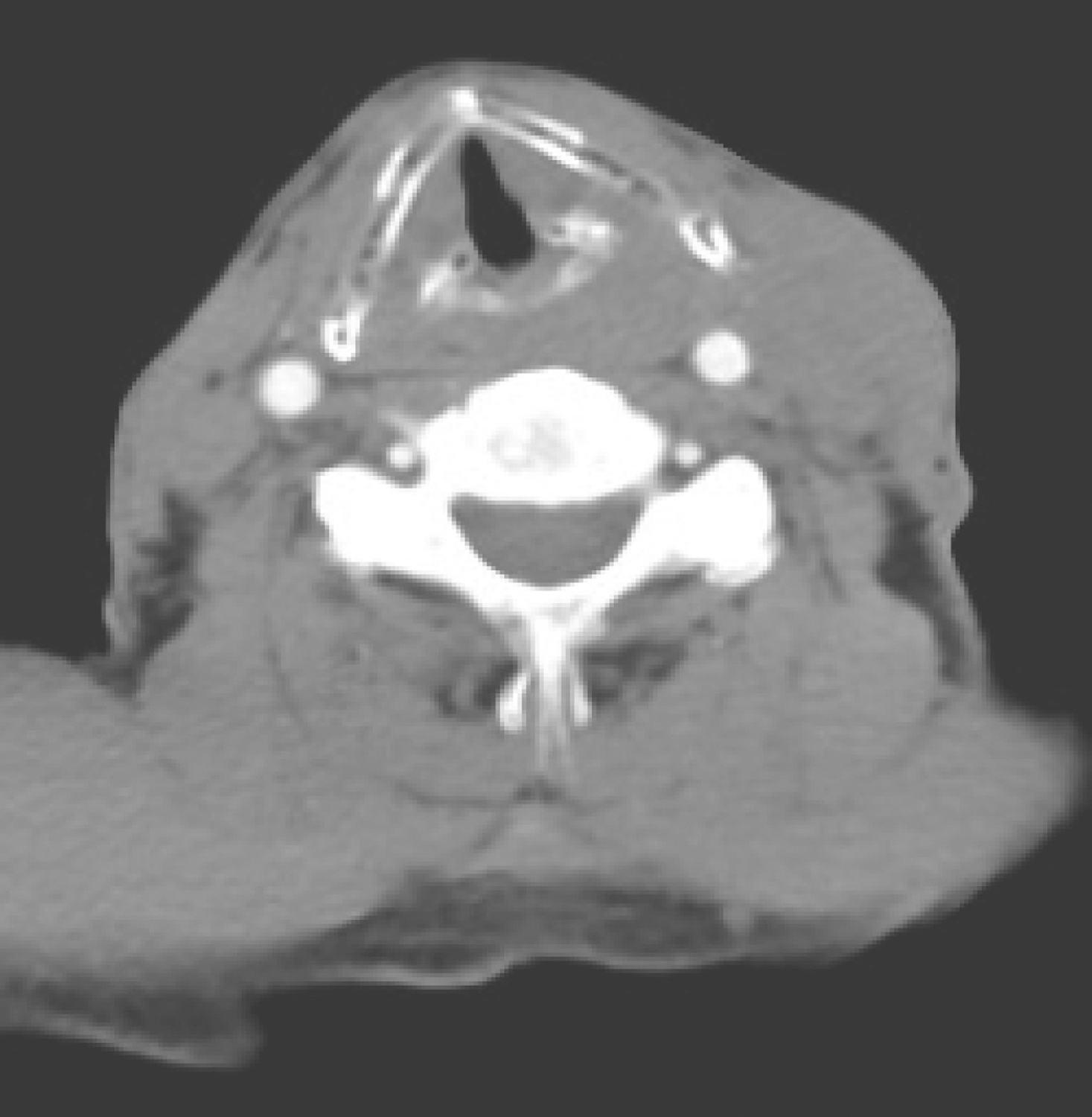 图1颈胸部增强CT示双侧杓会厌皱襞、环后可见软组织密度肿物