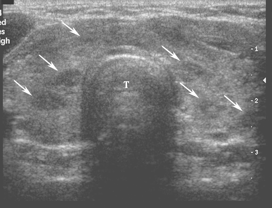 图2颈部正中横切面:甲状腺腺体回声不均匀,峡部增厚,可见多个无占位效应的低回声小结节(箭头所示),T:气管