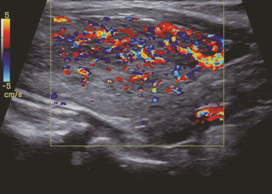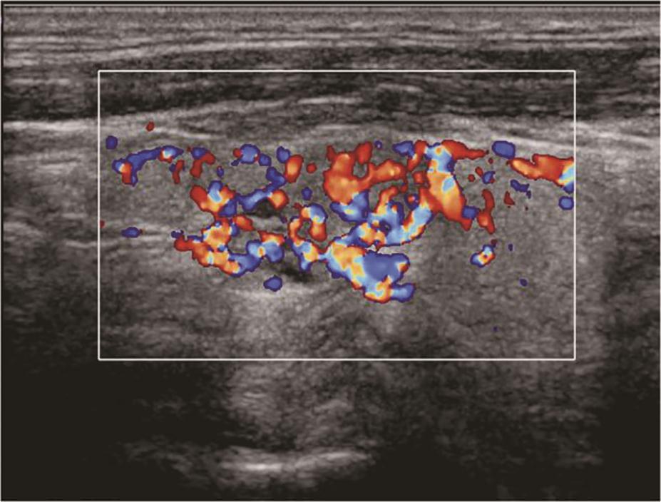 图17颈部正中偏右横切面:极低回声内可见丰富杂乱彩色多普勒血流信号