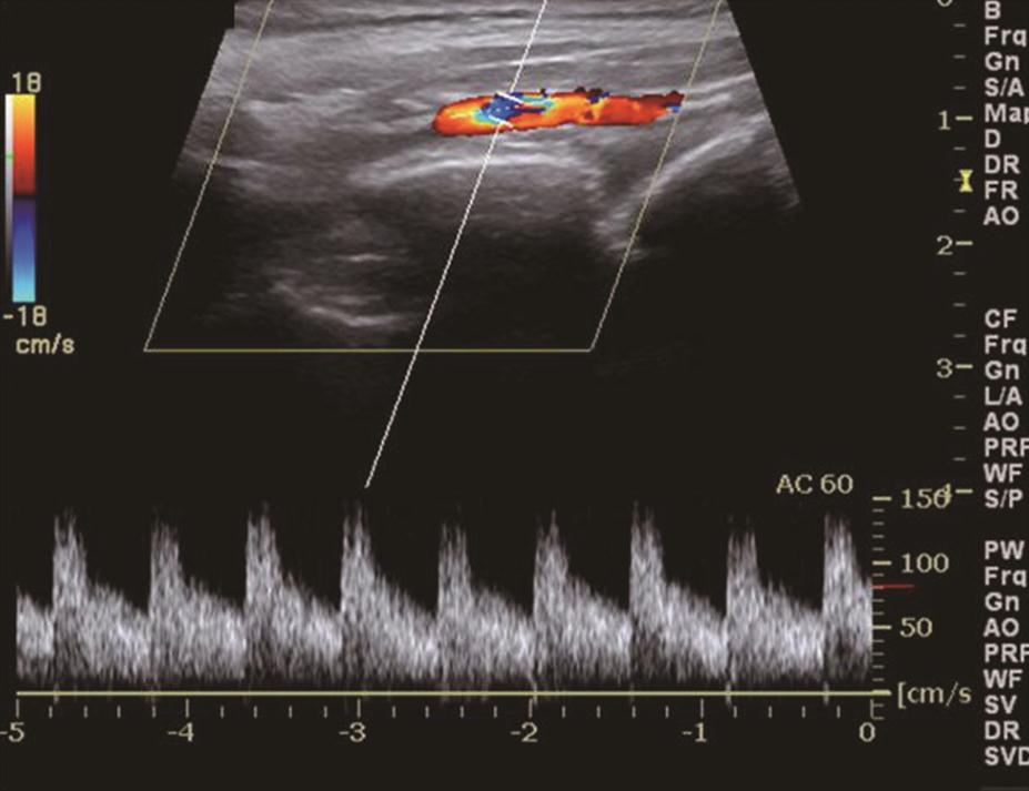 图4与图3同一患者,右侧甲状腺上动脉收缩期峰值流速高达140cm/s