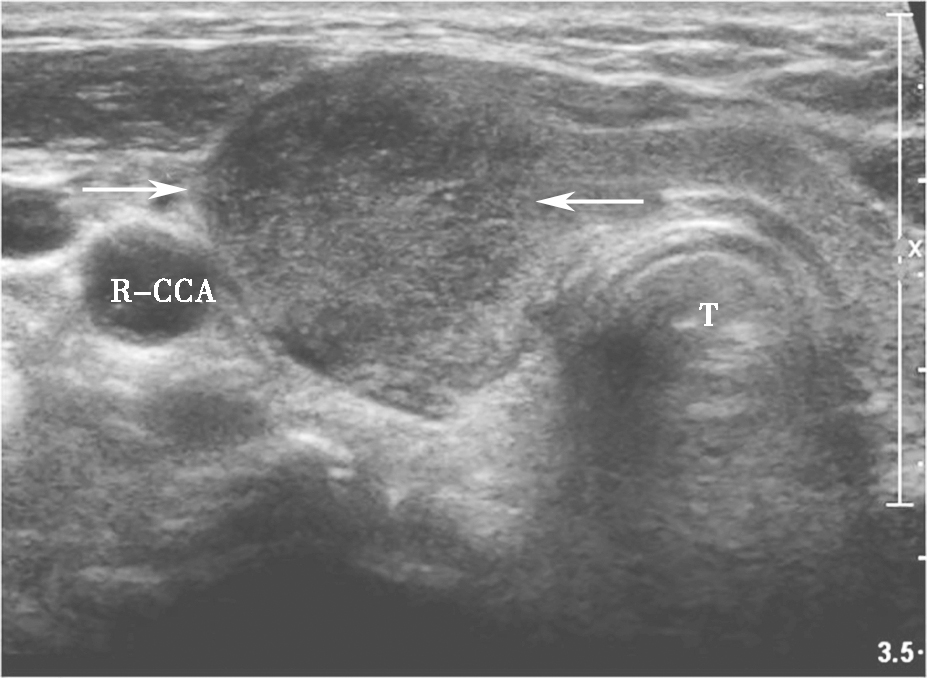 图5颈部正中偏右侧横切面:甲状腺右叶饱满,可见片状低回声,边界模糊(箭头所示)R-CCA:右侧颈总动脉,T:气管