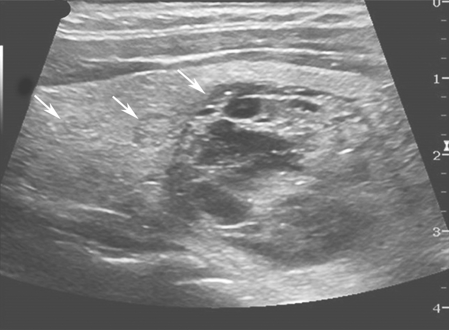 图20颈左侧纵切面:甲状腺乳头状癌患者,颈部侧方Ⅳ区淋巴结皮髓质分界不清(箭头所示),部分淋巴结内可见团状高回声,手术证实为颈侧方淋巴结转移