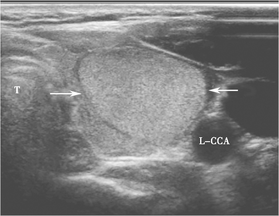 图7颈部正中偏左横切面:甲状腺左叶中等回声,形态规则、边界清晰,伴薄声晕(箭头所示)。T:气管;L-CCA:左侧颈总动脉