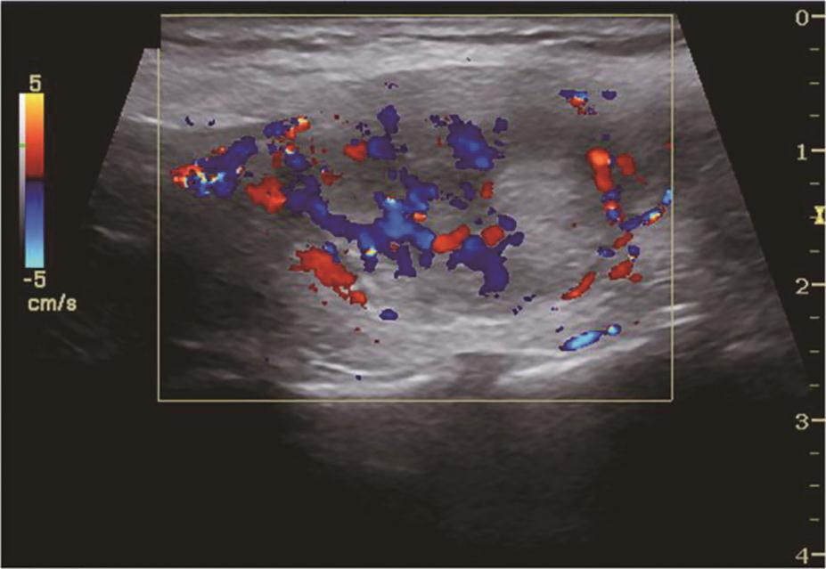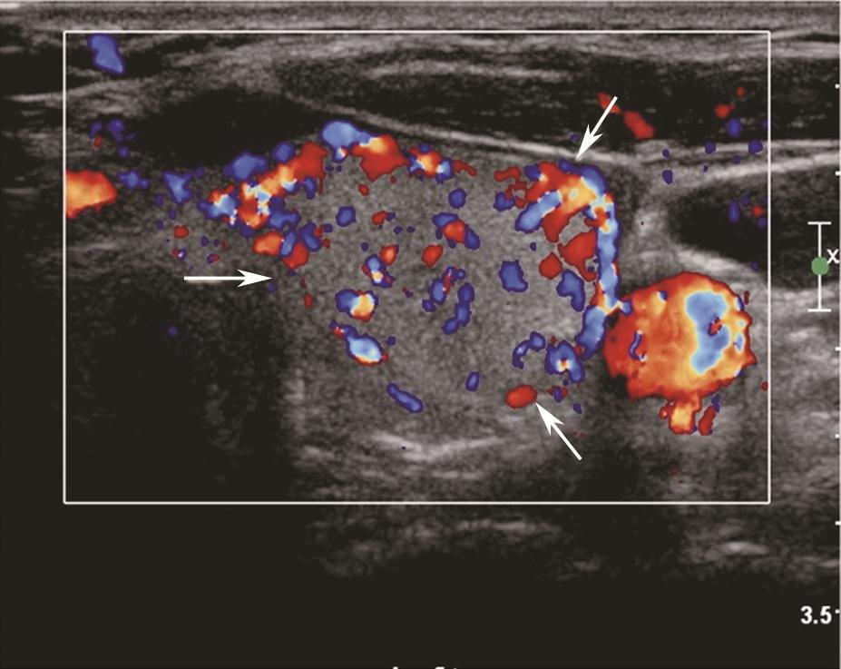 亚急性甲状腺炎超声表现为腺体内片状低回声,边界模糊,内可有散在的稍强点状回声,探头挤压时有压痛(图5)。低回声以外腺体彩色多普勒血流信号基本正常,低回声内部血流信号轻度增加或无明显增加,周边无明显血管绕行,部分低回声内部可显示正常甲状腺血管穿行。患者可伴有颈淋巴结增大。