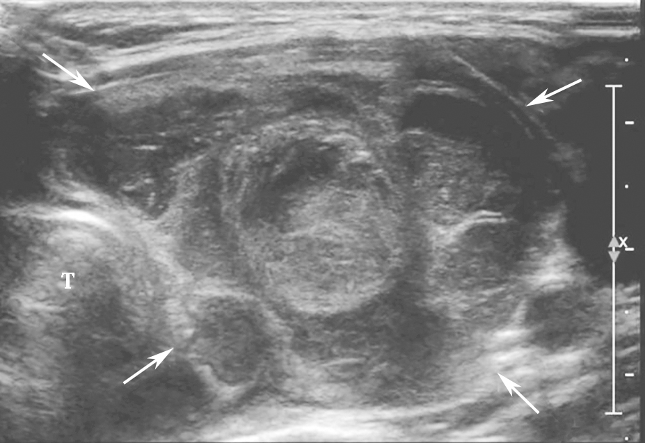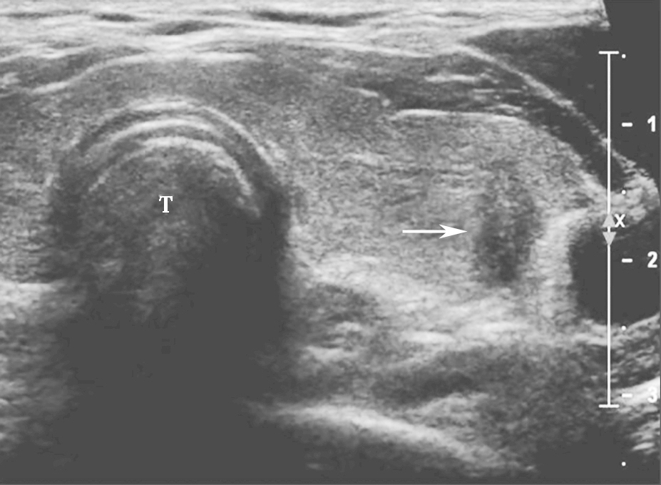 图9颈部正中偏左横切面:甲状腺左叶可见极低回声(箭头所示),形态多不规则,边界不清,纵横比大于1,内可疑点状强回声(微小钙化)T:气管
