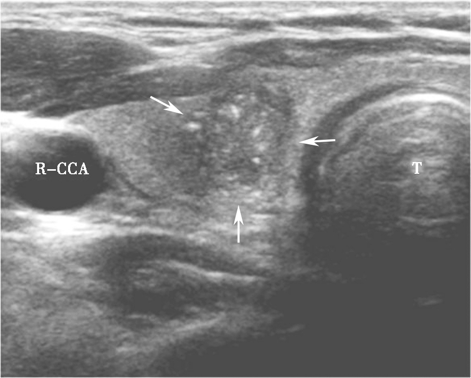 图10颈部正中偏右横切面:甲状腺右叶可见低回声(箭头所示),形态多不规则,边界不清,内可见点状强回声(微小钙化)。T:气管;R-CCA:右侧颈总动脉