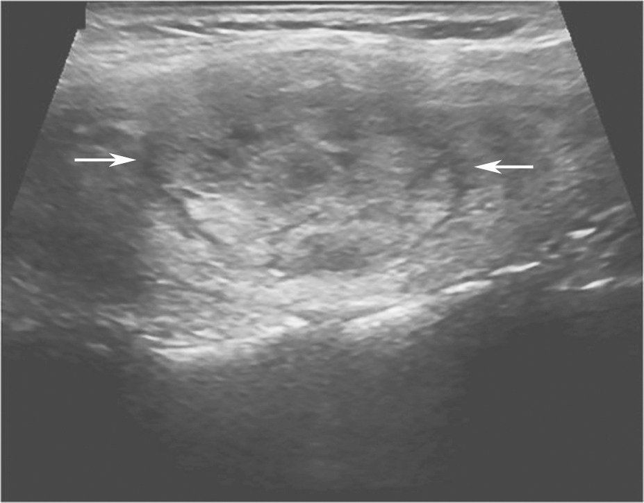 图11右侧颈部纵切面:甲状腺右叶中部中等回声(箭头所示):内部回声不均伴厚薄不一低回声晕