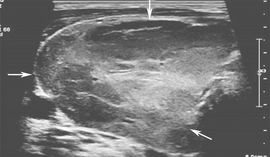 图15颈部正中偏左横切面:甲状腺左叶可见不均匀低回声,形态不规则,边界模糊(箭头所示)