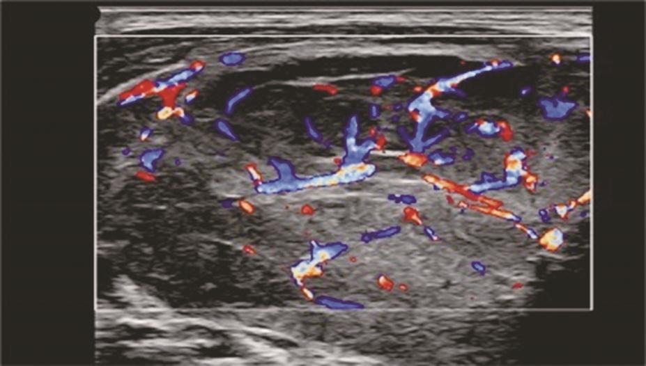 甲状腺淋巴瘤超声表现多样,可大致分为结节型、弥漫型、混合型。结节型多见,多为极低回声,边界清楚,后方回声增强,呈“假囊征”,钙化或液化很少出现,有时低回声可呈“蜂窝状”改变;弥漫型表现为双侧叶肿大,内部为极低回声,肿瘤和甲状腺组织的分界无法识别;混合型表现为多个极低回声病灶,不均分布在腺体内(图16)。上述各型共同特点为病变呈极低回声,后方回声增强,病灶内部血流信号丰富(图17,图18)。