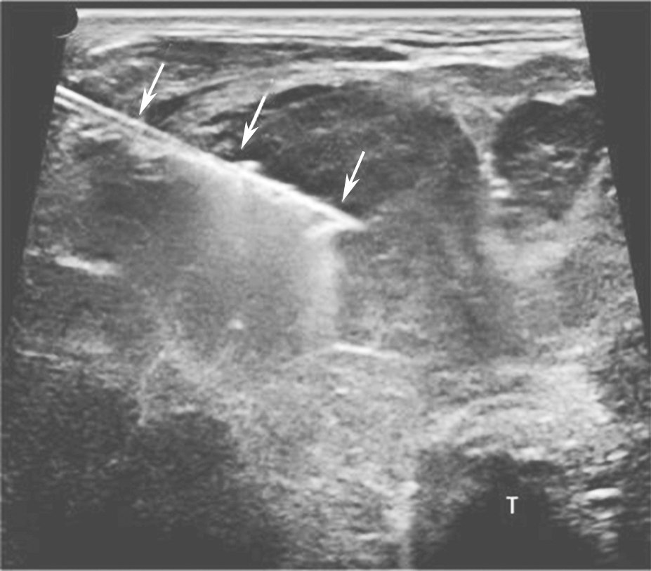 图18颈部正中偏右横切面:甲状腺右叶粗针组织活检,箭头所示为穿刺针回声