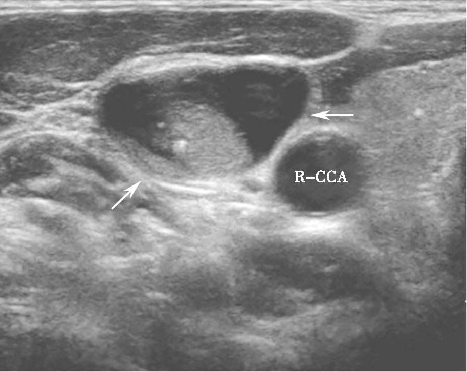 图19颈右侧横切面:甲状腺乳头状癌患者,颈部侧方Ⅳ区可见囊实性混合回声(箭头所示),实性成分偏心分布,内可见点状回声,手术证实为颈侧方淋巴结转移