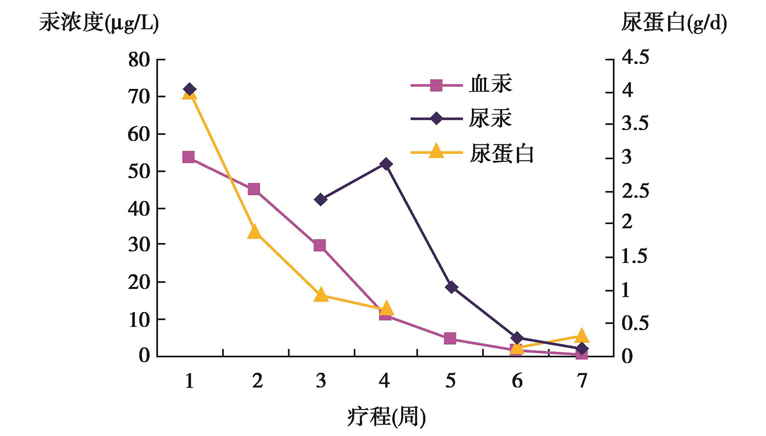 图1驱汞治疗后血/尿汞浓度及尿蛋白变化