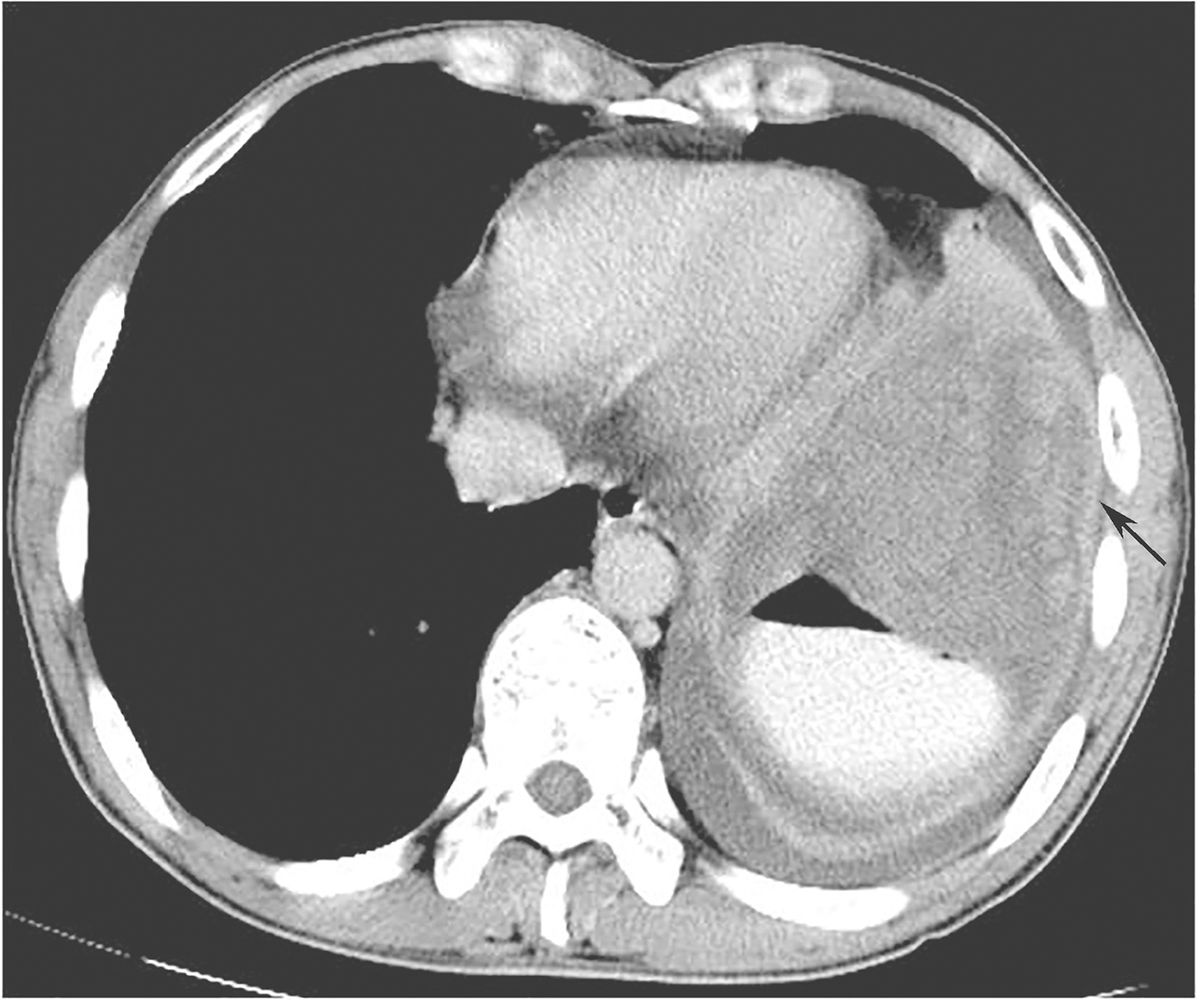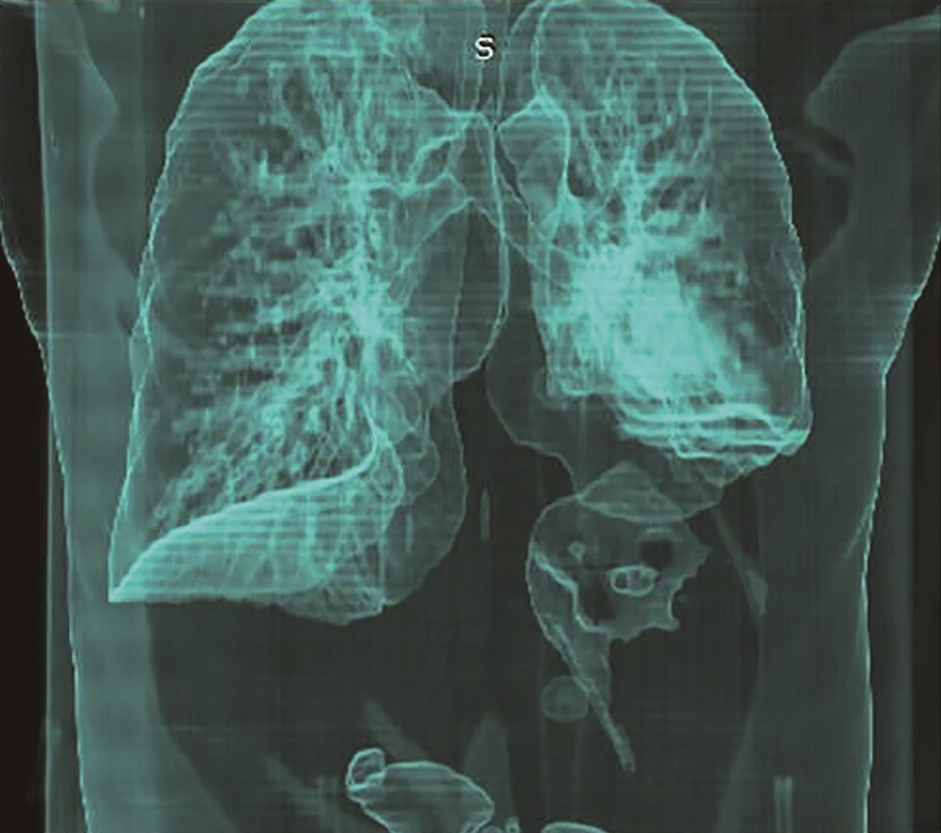 图2首诊CT三维重建示左侧膈肌侵犯可能性大
