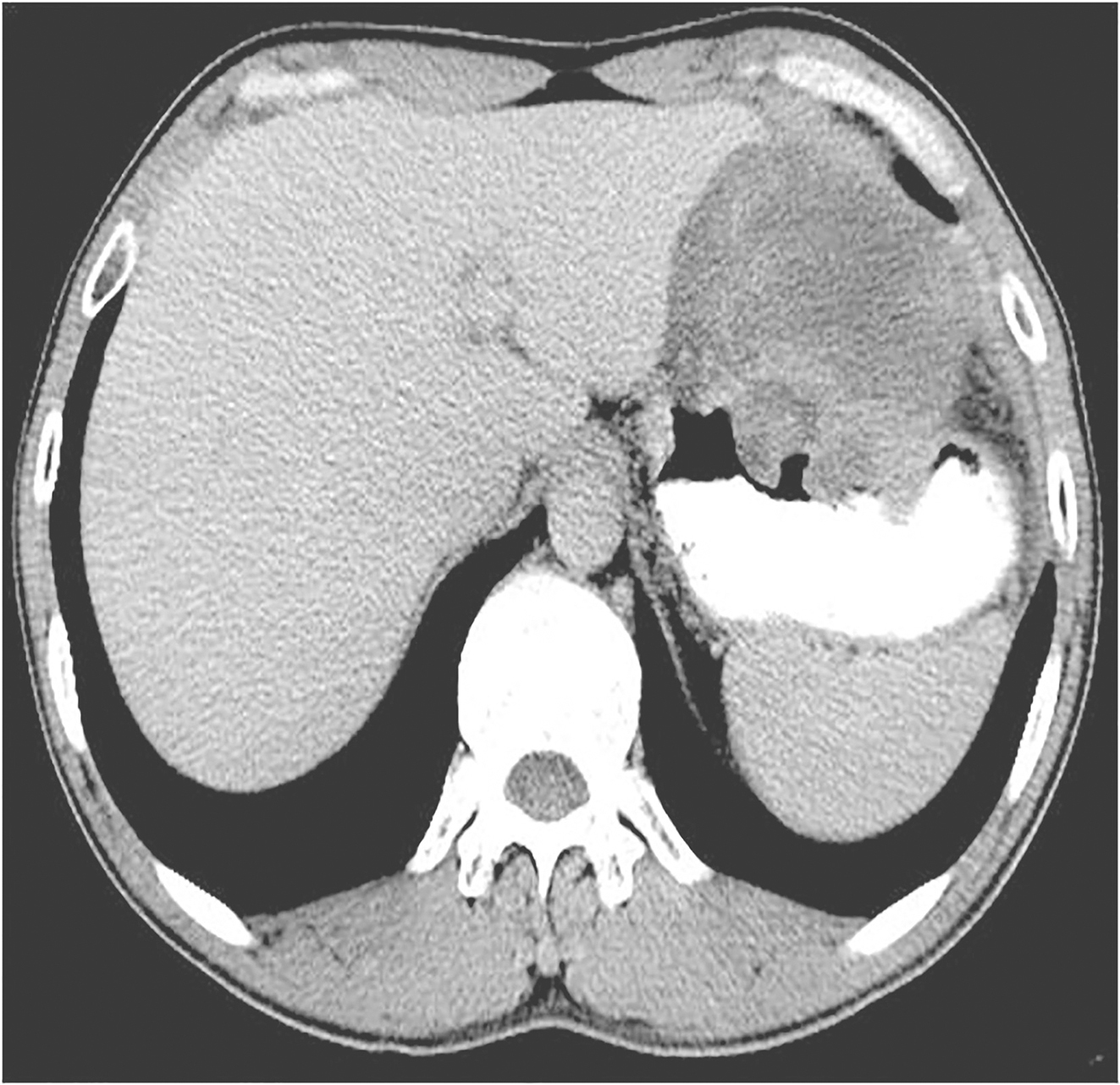 患者,男性,36岁,2012年9月26日因“吞咽阻塞感伴左肩疼痛3个月”就诊于福建医科大学附属协和医院。患者3个月前出现吞咽阻塞感,无法进食,上腹闷胀不适,伴左肩部疼痛,呈持续性,与体位无明显关系。无反酸、嗳气等症状。曾在当地医院按“胃炎”予治疗后症状无缓解。于4天前在当地医院行胃镜检查,示“胃底贲门区黏膜下巨大隆起型病变,考虑肿瘤”。遂转诊至福建医科大学附属协和医院,门诊拟“胃底贲门区占位性病变”收住院。发病以来,患者体重减轻3kg。