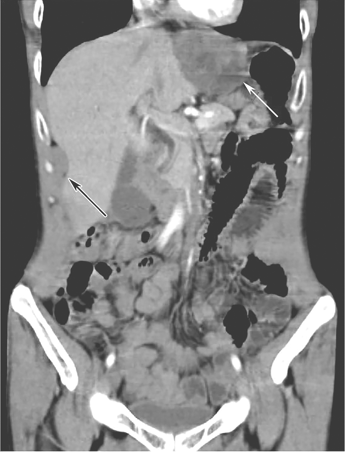 图4伊马替尼辅助治疗30个月后全腹增强CT(冠状位)