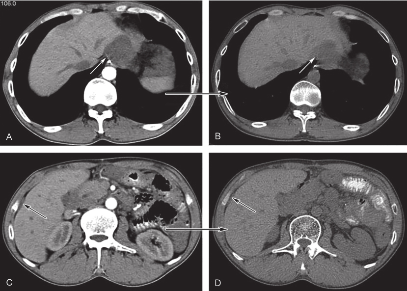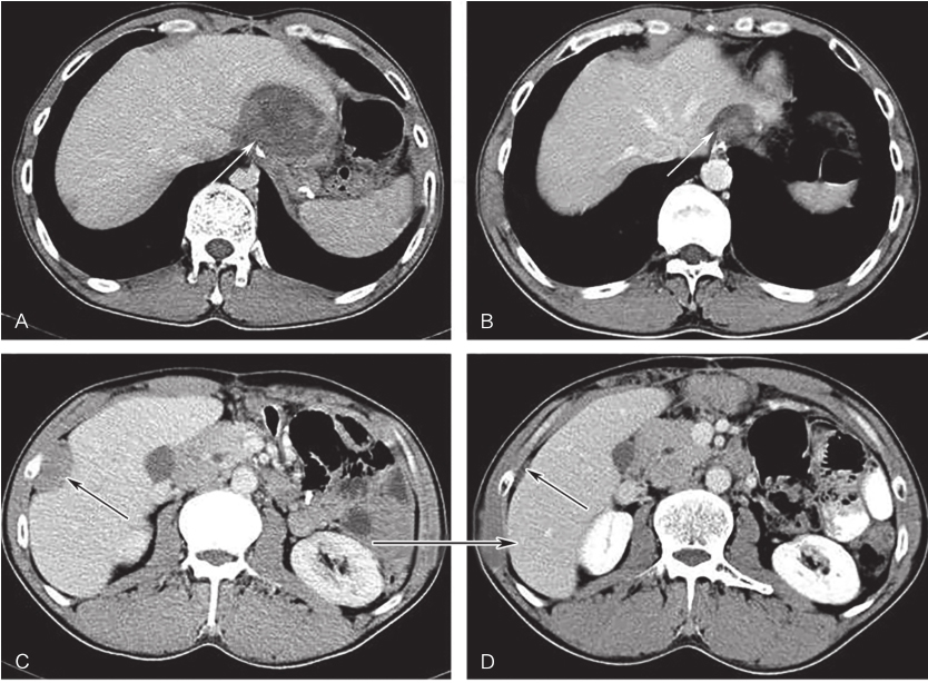 A、C.治疗前病灶;B、D.治疗6个月后病灶;白色箭头示吻合复发病灶,黑色箭头示肝包膜转移灶