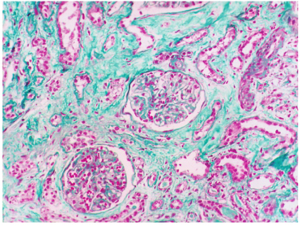 图1马兜铃酸肾病:肾小球无明显病变,肾小管萎缩、消失,裸基底膜形成,肾间质无细胞性硬化(Masson×200)