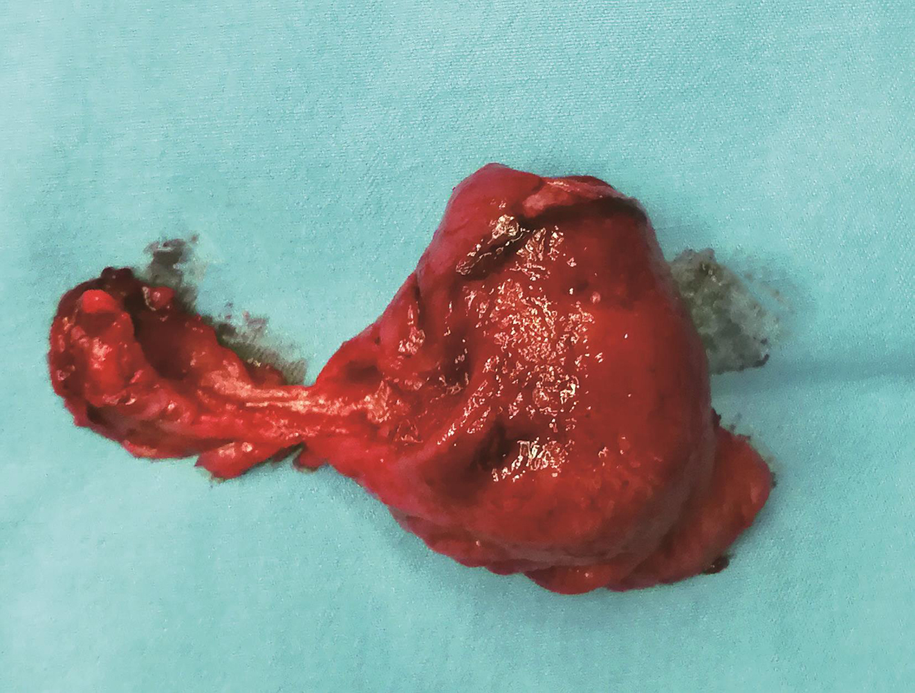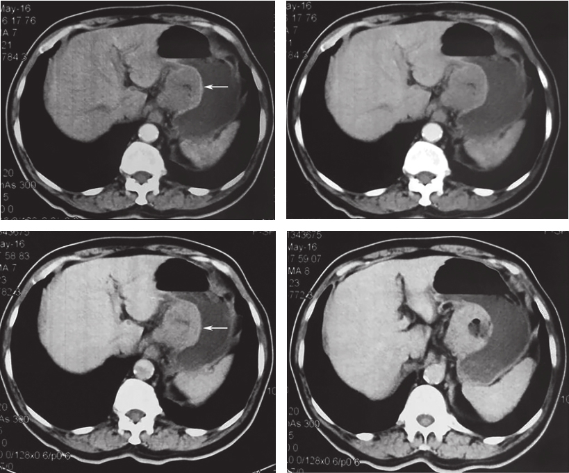 患者于术后5天进食半流质饮食,术后12天拔管出院。病理证实为低危胃GIST,未进行伊马替尼辅助治疗。截至2018年12月中旬,门诊及电话随访,患者生活质量良好,未诉明显不适。