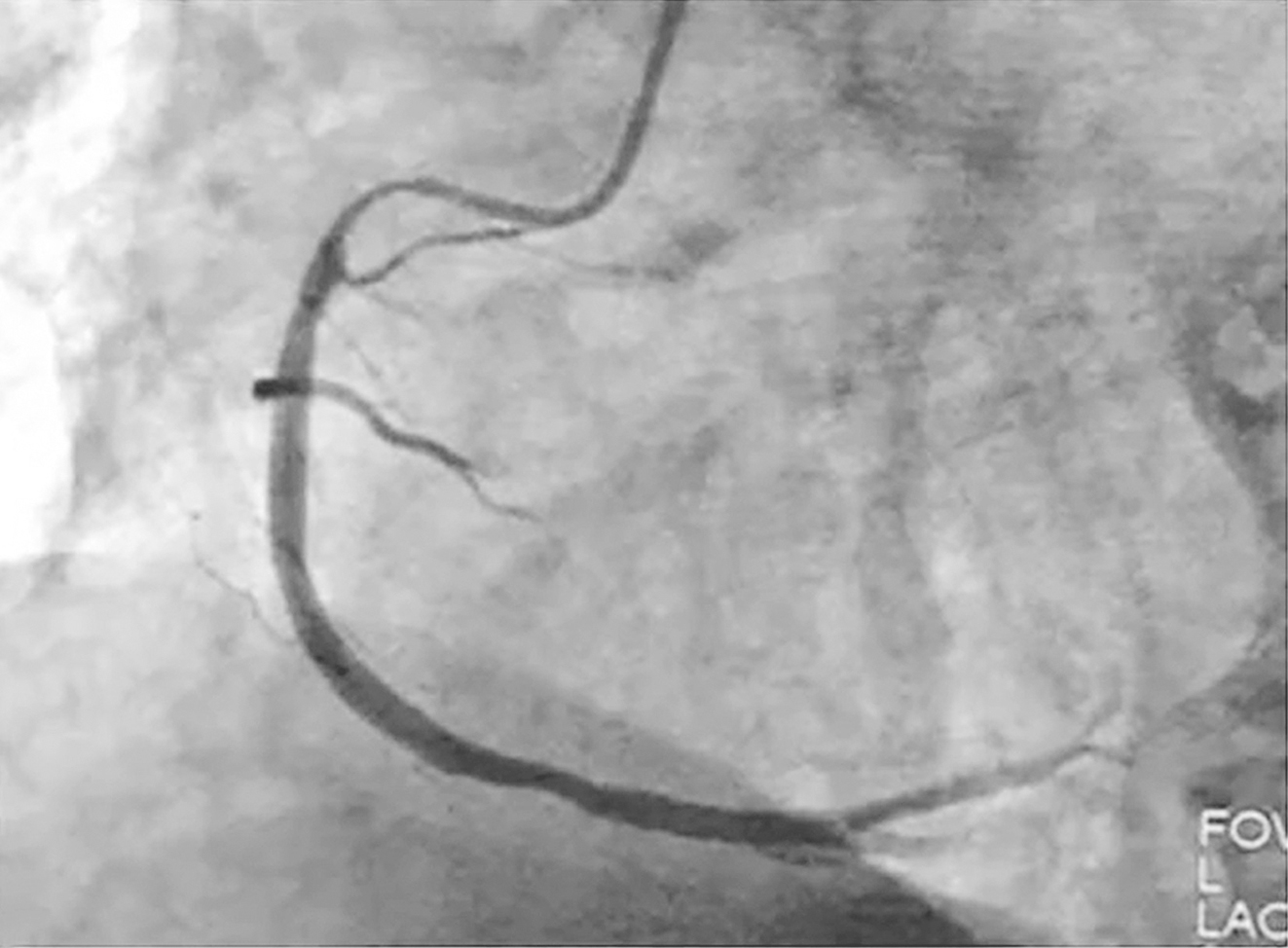 笔者单位冠脉造影:冠心病,冠脉三支严重病变,前降支中段第一对角支发出后闭塞,回旋支中段第一钝缘支发出后闭塞,右冠脉开口处狭窄95%(图2)。