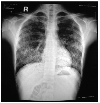 血 WBC 8.27×109/L,PLT 238×109/L,Hb 81.0g/L。ESR 26mm/h。尿 RBC满视野,为变形红细胞,尿蛋白定量 4.67g/d。血 SCr 634.0μmol/L,BUN 26.3mmol/L,ALB 24.3g/L,肝功能正常。RF阴性,CRP阳性,ANCA阴性,ANA、抗dsDNA、ENA阴性,抗GBM抗体阳性(百分结合率98%)。动脉血气分析:pH 7.352,PO269mmHg,PCO238mmHg,SaO293%。 胸片:两肺满布粟粒状模糊影,以两肺中下野为著,部分融合成团片状,肺野透过度差(图1)。