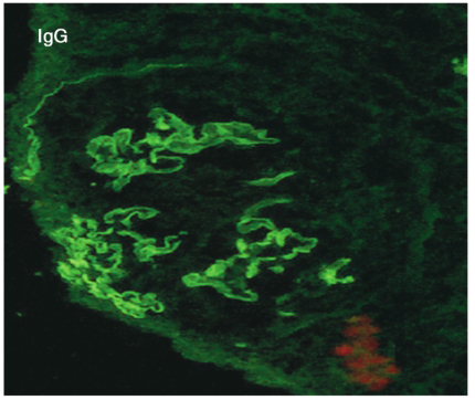 肾小球新月体形成,IgG沿肾小球毛细血管壁呈线样沉积(免疫荧光×400)