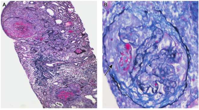 肾小球毛细血管袢破坏,细胞纤维性新月体形成(↑),(A:PASM×100,B:PASM ×400)
