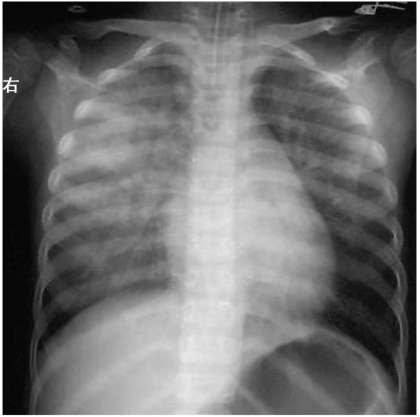 胸部X线检查提示两肺野透亮度减低,广泛分布的大片状阴影