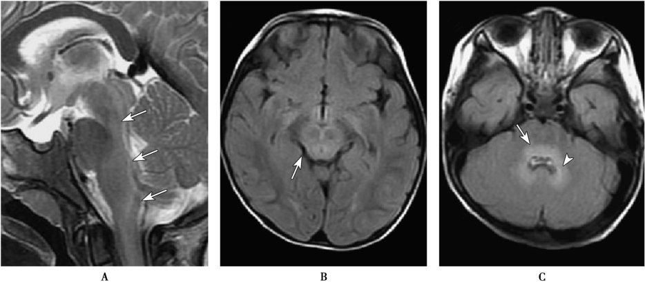 A.矢状面T2WI显示大脑脚至颈髓的脑干背侧有连续的斑片状高信号(白色箭头);B.FLAIR显示中脑呈高信号(白色箭头);C.FLAIR,在脑桥背部(白箭)和齿状核(白色箭头)显示高信号