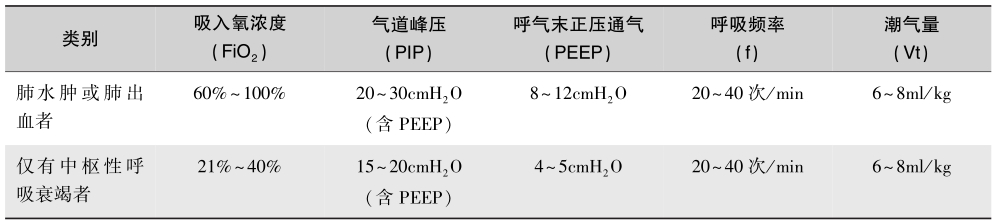 常用压力控制通气,当出现顽固性低氧血症者可考虑使用高频通气。氧合目标,维持PaO2>60mmHg,动脉血氧饱和度(SaO2)>92%。对于出现肺水肿或肺出血者或仅有中枢性呼吸衰竭者,按照机械通气呼吸机初调参数表(表1)进行调节。若肺出血未控制或血氧未改善,可每次增加PEEP 1~2cmH2O,一般不超过20cmH2O,注意同时调节气道峰压(PIP),以保证正常氧合水平。肺水肿及出血控制后,逐步下调呼吸机参数。