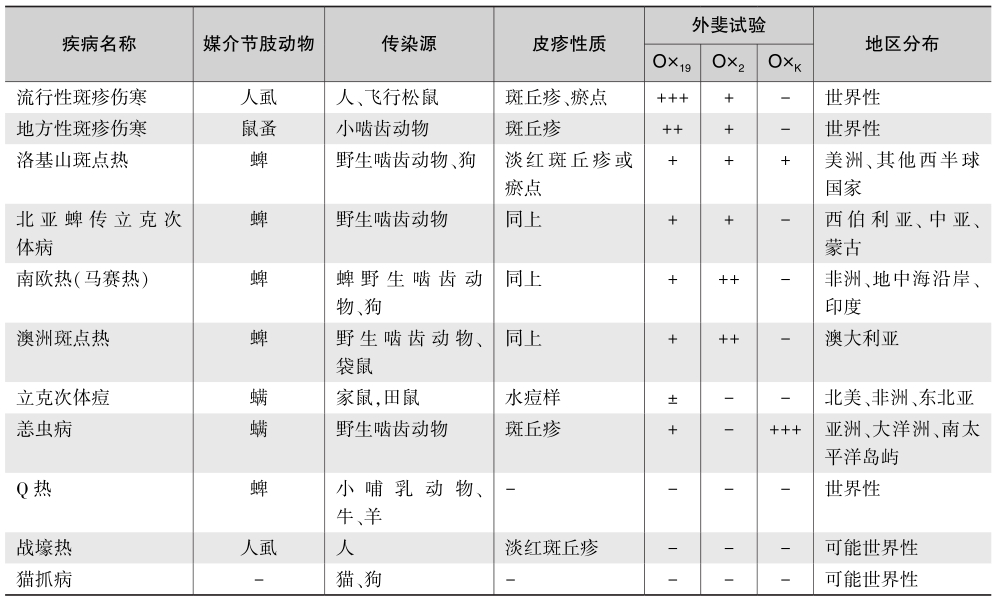 用于立克次体病诊断的方法虽有多种,但最常用者仍为外斐试验。其原理为变形杆菌菌体抗原与立克次体有交叉抗原,故可用于立克次体的检测,如O×2与斑点热群、O×19与斑疹伤寒群、O×k与恙虫病东方体。宜取2份或3份血清标本(初入院、第2周和恢复期),滴定效价在1∶160以上者为阳性,有4倍以上升高者则更具诊断意义。外斐试验简便,阳性率为70%~80%,但特异性较差,可与回归热、疟疾、伤寒以及变形杆菌感染等交叉凝集而出现假阳性。而且此反应出现较晚,不能作早期诊断,不能鉴别流行性斑疹伤寒与地方性斑疹伤寒,因此诊断价值有限。特异性与敏感性较好的血清学诊断方法为IFA、ELISA、固相放射免疫测定(solid-phase radioimmunoassay,SPRIA)以及间接血凝试验等检测特异性IgM或IgG,其特异性高,可鉴别流行性斑疹伤寒与地方性斑疹伤寒,而且敏感性高,若检测特异性IgM可用于早期诊断。在欧美,特异性与敏感性高的血清学诊断方法已经代替外斐试验成为实验室诊断的主要方法。此外,免疫电镜、PCR检测也有助于诊断,但临床上应用较少或仅供研究之用。